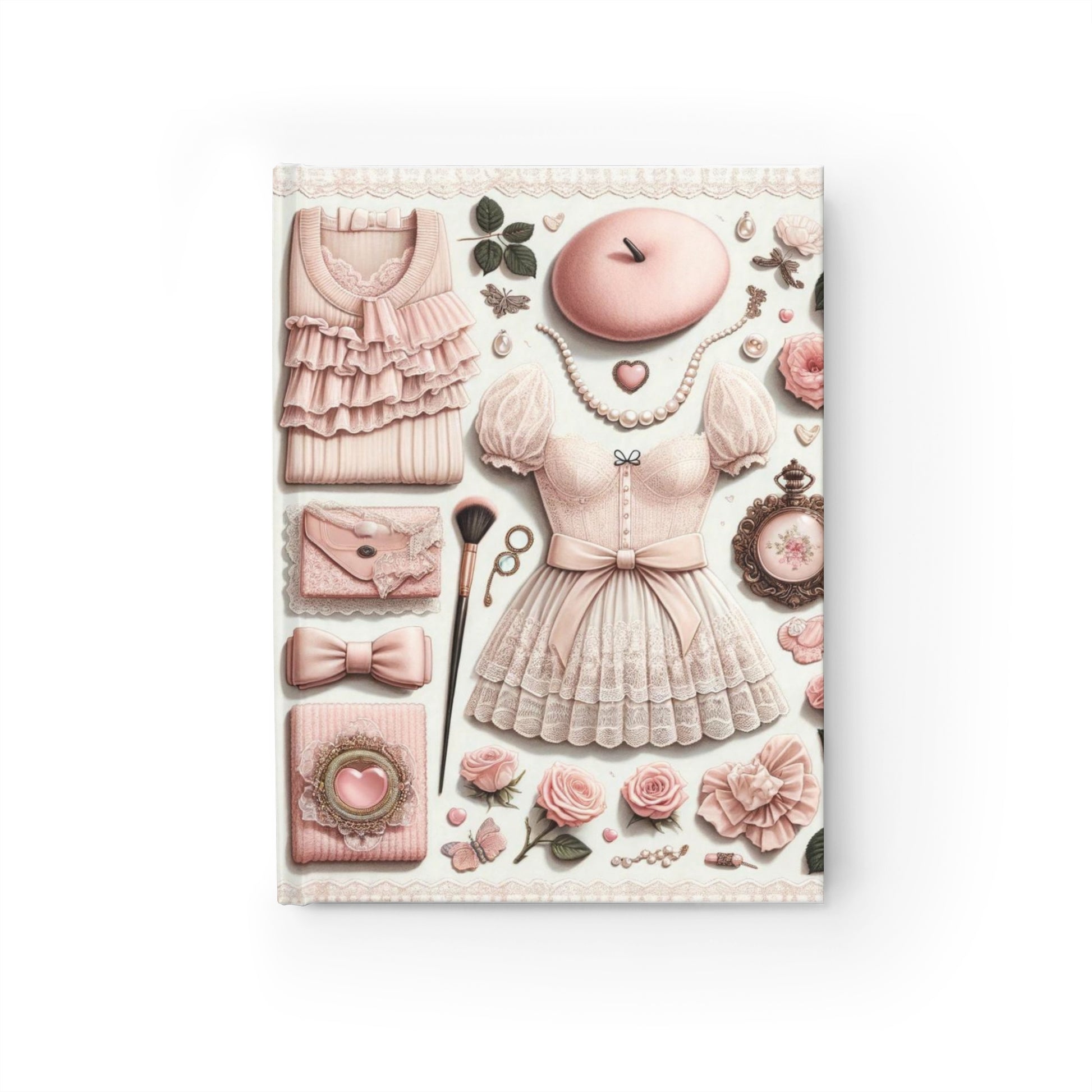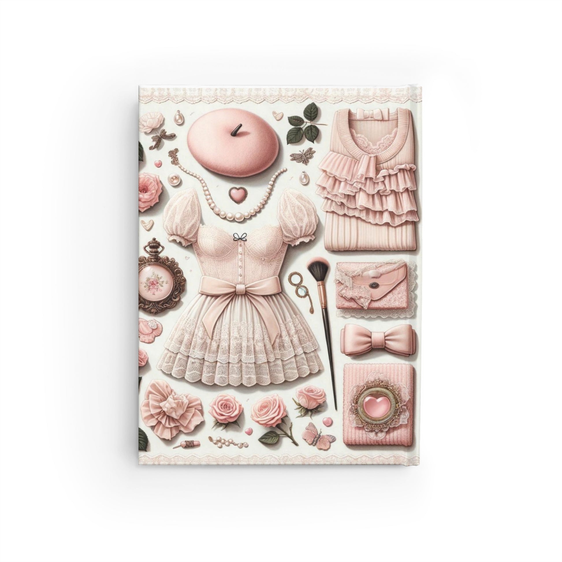 This journal features a curated collection of items that embody the charming coquette aesthetic. Against a light background, you'll find an array of delicate and feminine objects: a pale pink beret, a frilly blouse, and a corset-style top, pearl necklaces, a bottle of nail polish, a makeup brush, and a clutch purse adorned with a dainty bow. A vintage pocket watch adds a touch of timeless elegance to the ensemble.