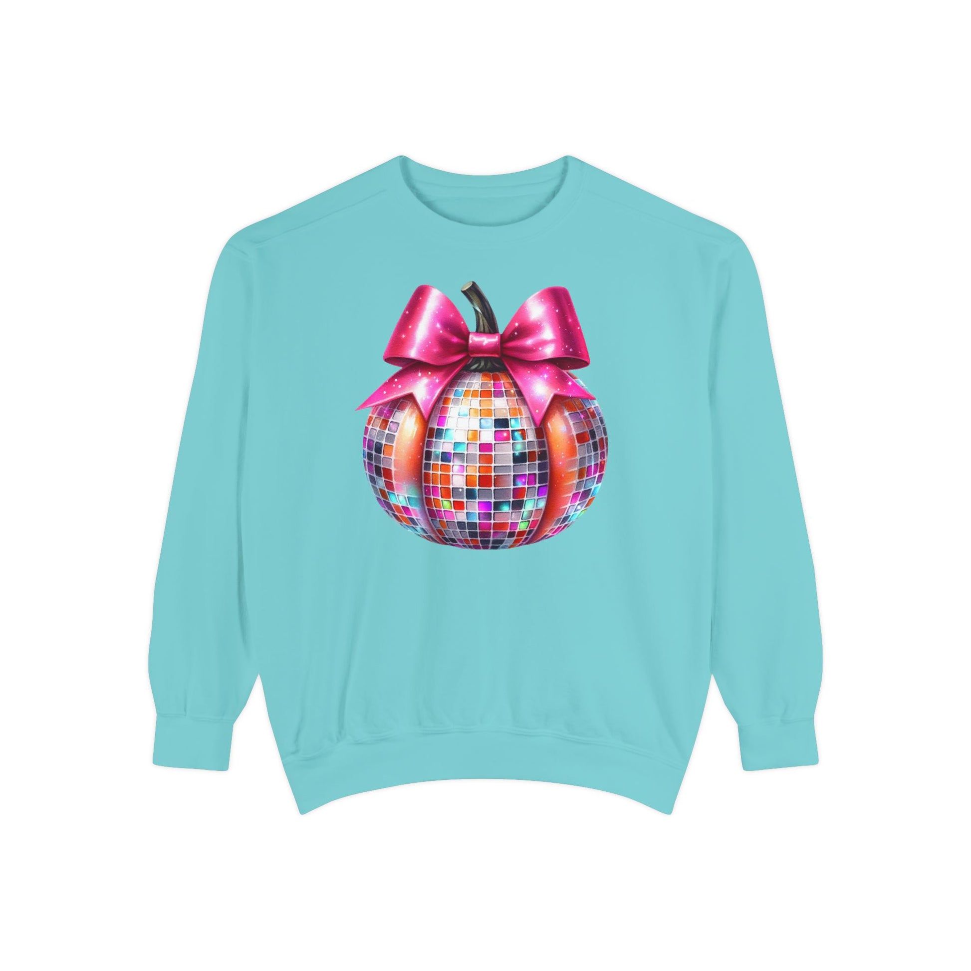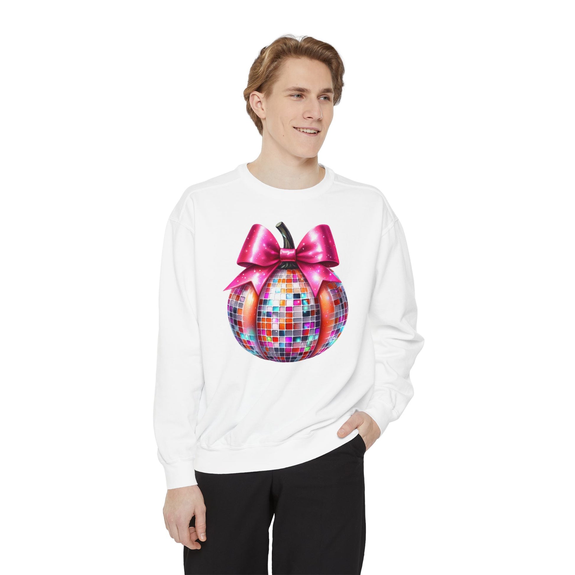 Disco Pumpkin Sweatshirt, Coquette Halloween Jumper, Colorful Fall Pullover, Unisex Garment-Dyed Sweater, Pink Bow Design, Harvest Festival