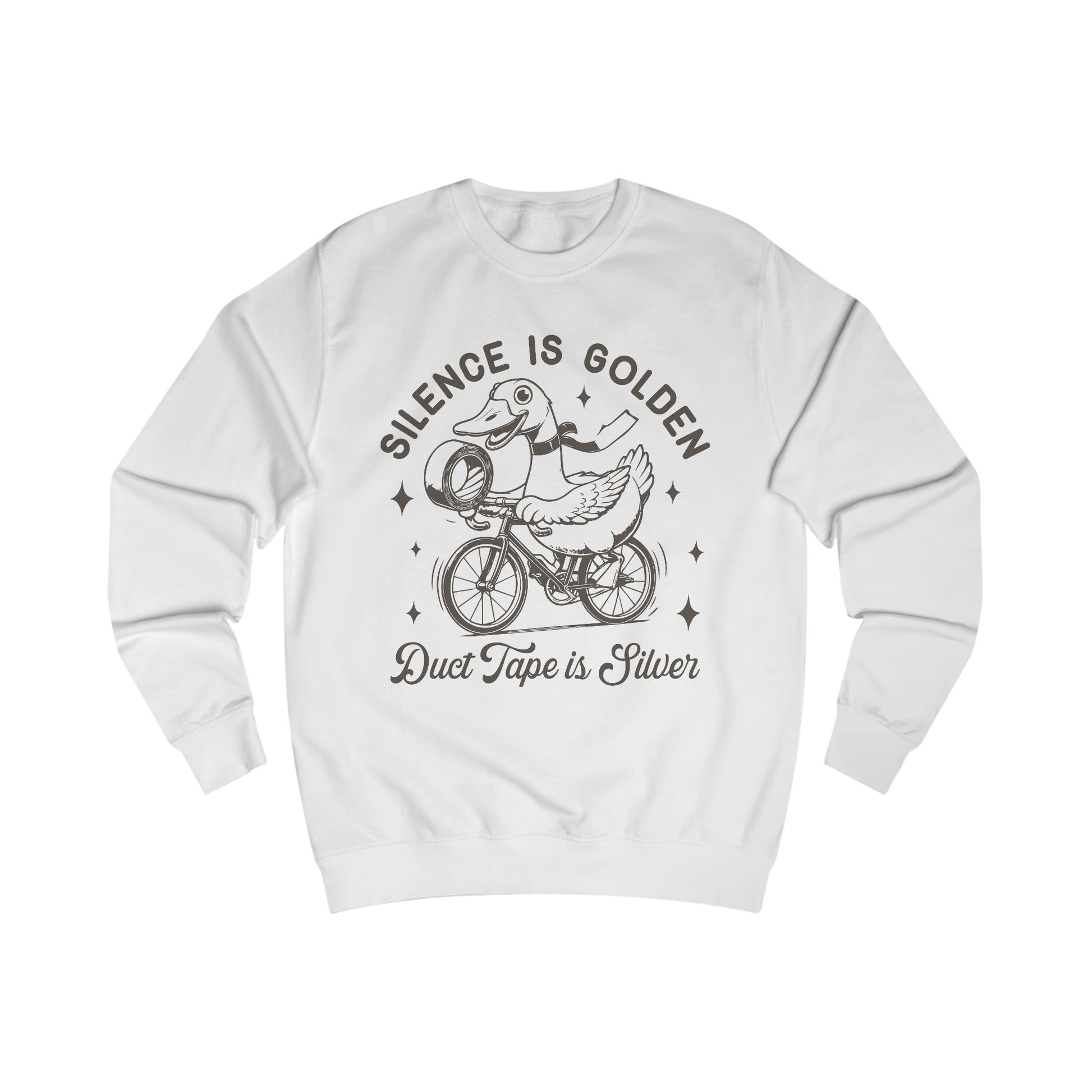 Duck Tape Unisex Sweatshirt, Funny Duck Riding Bicycle Jumper, Silence is Golden, Silver Tape, Animal Lover Gift, Novelty Sweater