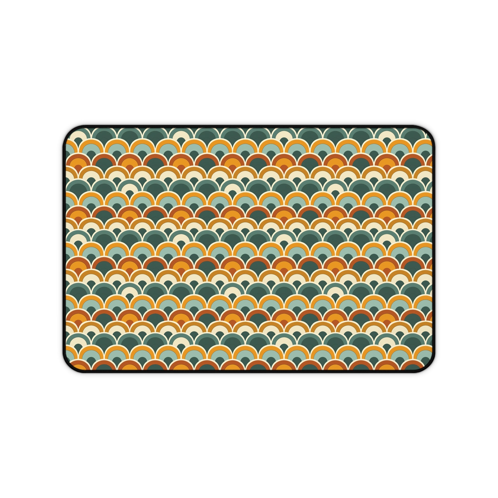 Introducing our Earthy Overlapping Arches Desk Mat – a sophisticated and artistic addition to your workspace that effortlessly combines geometric elegance with natural earthy tones. This desk mat is more than just a functional accessory; it's a work of art, featuring a mesmerizing pattern of overlapping arches in a repeated motif, rendered in shades of green, blue, beige, and rusty orange.