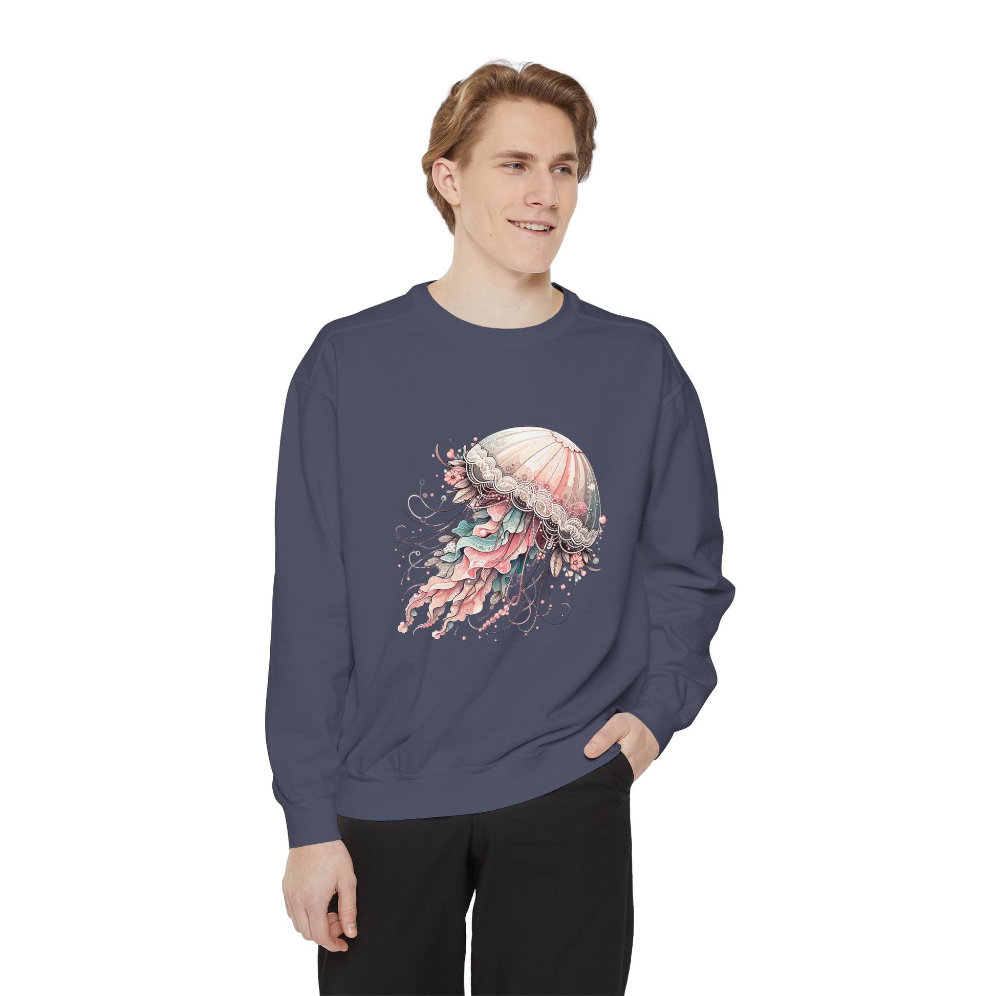 Our "Jellyfish Dreams" Sweatshirt is perfect for those who appreciate the beauty in the unusual, the art in the everyday, and the dreamy allure of the ocean's mysteries. Whether you're wearing it as a fashion statement or as a canvas to express your unique style, this sweatshirt is a testament to the limitless creativity that can be found in the natural world.