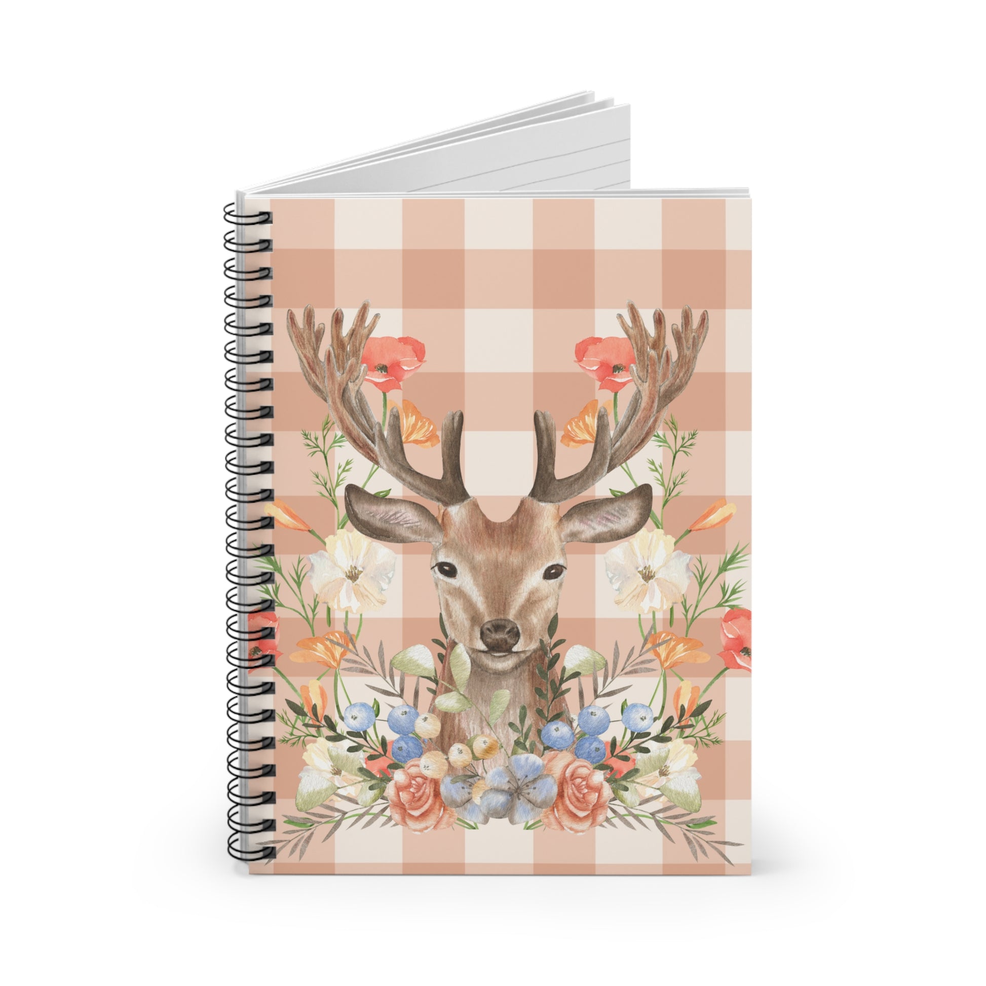 This notebook features a delightful peachy gingham print background, reminiscent of a serene countryside picnic on a sunny day. In the foreground, a whimsical graphic portrays a majestic deer surrounded by a lush bouquet of vibrant flowers. It's a scene that captures the tranquility and grace of nature.