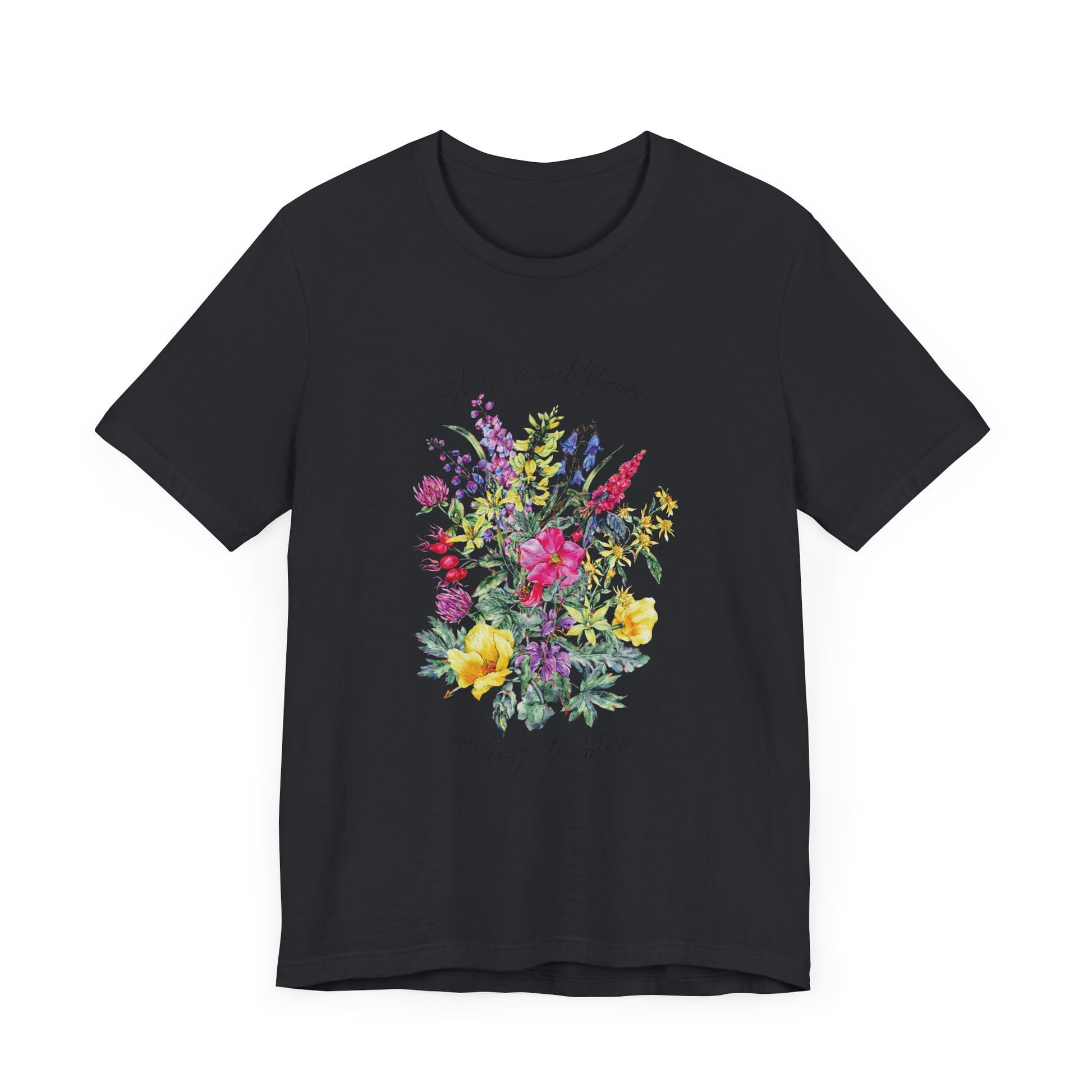 Adorned with a captivating bouquet of wildflowers, this shirt celebrates the untamed beauty and boundless potential within each of us. Vibrant blossoms in hues of pink, yellow, and blue dance across the fabric, exuding a sense of freedom and vitality.